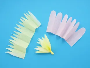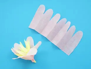 Male am Ende der roten, gefalteten Tücher runde Blütenblätter auf. Am Ende der gelben Tücher malst du spitze Blütenblätter auf. Wenn du kreativ sein möchtest, kannst du dir eigene Formen überlegen. Schneide die Formen mit der Schere aus.
