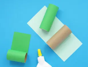 Um die Stiele herzustellen, verwendest du das grüne Papier. Schneide zuerst die Küchenrolle auf verschiedene Längen zu. Dann misst du das grüne Papier entsprechend ab, schneidest es zu, wickelst es um die Rollen und klebst es fest. Dieser Schritt kann klebrig werden und ist deshalb bei den Kleinen besonders beliebt!
