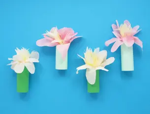 Trage etwas Kleber innen an den Kanten der Stiele auf und setze die Blumen aus Papier hinein. Lasse sie eine Weile trocknen.