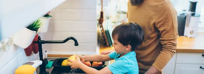 Sich vor dem Kochen und Backen die Hände zu waschen ist die wichtigste Regel für die Hygiene in der Küche. Erklären Sie den Kleinen, dass, obwohl es auch gute Arten von Bakterien gibt, manche Keime krank machen können. Deshalb sollten die Hände blitzblank sein, bevor man Lebensmittel anfasst, damit die ganze Familie gesund bleibt.